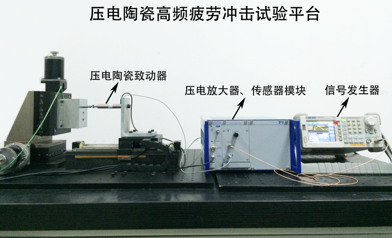 壓電陶瓷高頻疲勞沖擊試驗平臺(1 Hz < f ≤ 1 kHz),該試驗平臺包括:直線電機、Kistler 9203單通道測力儀、壓電陶瓷致動器、壓電放大器、傳感器模塊、信號發(fā)生器等設(shè)備。其驅(qū)動通過Renishaw光柵尺閉環(huán)系統(tǒng)控制,重復(fù)定位精度可達0.5μm,其Kistler單通道測力系統(tǒng)的采樣頻率可達27kHz。該試驗平臺可針對材料進行高頻疲勞沖擊試驗,從而研究其抗高頻疲勞性能。