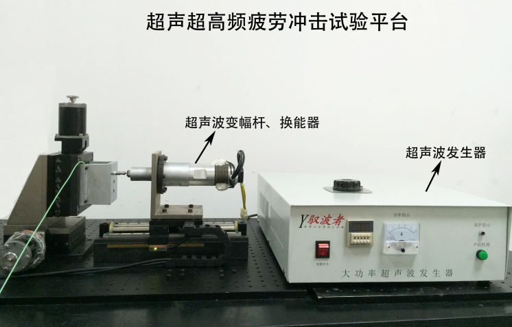 超聲超高頻疲勞沖擊試驗平臺(f > 1 kHz),該試驗平臺包括:直線電機、Kistler 9203單通道測力儀、超聲波變幅桿、換能器、超聲波發(fā)生器等設(shè)備。其驅(qū)動通過Renishaw光柵尺閉環(huán)系統(tǒng)控制,重復(fù)定位精度可達0.5μm,其Kistler單通道測力系統(tǒng)的采樣頻率可達27kHz。該試驗平臺可針對材料進行超高頻疲勞沖擊試驗,從而研究其抗超高頻疲勞性能。