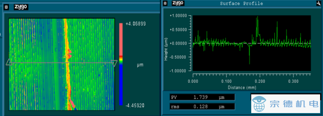 商用的球盘摩擦试验机均需要长时间的磨合过程,在摩擦过程达到稳态之前,摩擦副已经发生了严重的磨损,表面形貌发生了极大程度的改变,因此不能用于研究特定表面形貌(特定表面粗糙度、表面微织构等)的摩擦试验,本超高速球-盘摩擦试验机由于降低了摩擦盘的端面跳动,可以极大程度的降低磨合过程,实现近无磨损的摩擦学测试,因此可以用于特定表面的摩擦学测试。无氧铜与单晶金刚石组成的摩擦副摩擦后无氧铜的表面形貌如图7所示。
