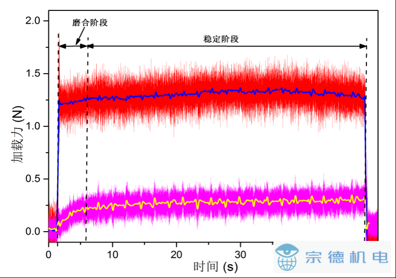 由于极大程度的降低了摩擦盘的端面跳动,相对于商用球-盘摩擦试验机而言,可以将摩擦时间急剧减小,同时提高摩擦过程的稳定性,典型的摩擦力和加载力原始力信号如图4所示。
