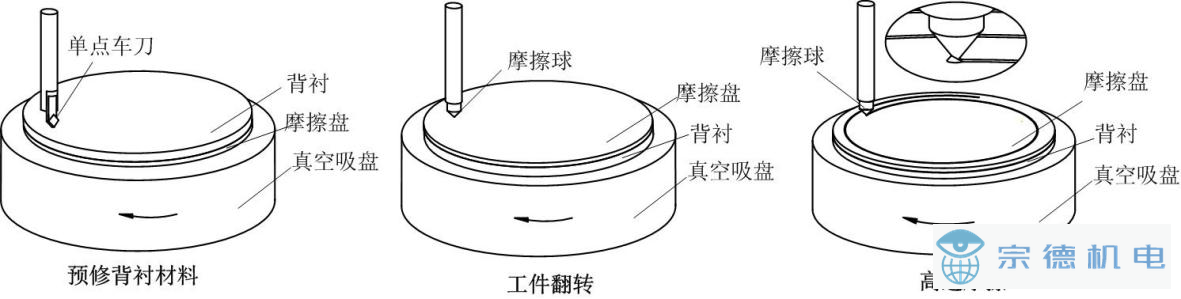 平台主要包括: 铸铁床身、内藏式动静压电主轴、高精度直线运动模组(水平方向和垂直方向)、原位动平衡系统、精密压电式测力仪等, 如图1所示。试验前对摩擦盘及主轴系统进行原位动平衡,大幅度降低主轴-摩擦盘系统在高速旋转条件下的振动,增加测试的稳定性。对于易切削加工材料,在试验前对摩擦盘进行在线超精密车削,极大程度的降低摩擦盘端面的跳动,如图2所示。对于难切削加工材料,通过增加背衬材料,辅助以互为基准超精密原位车削,降低摩擦盘的端面跳动,如图3所示。